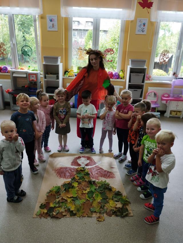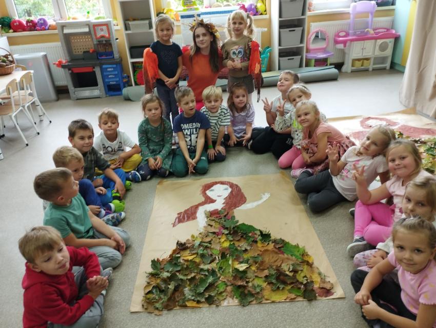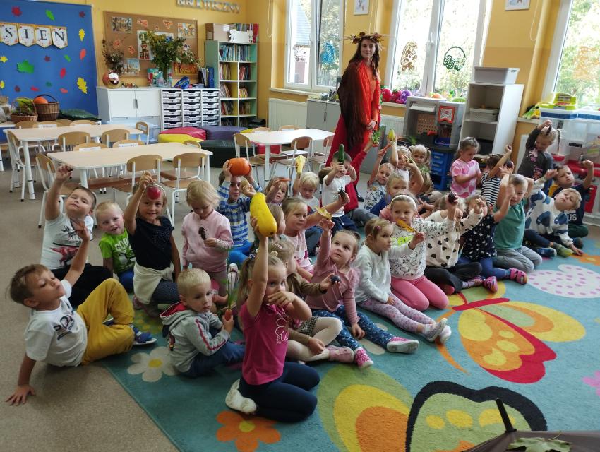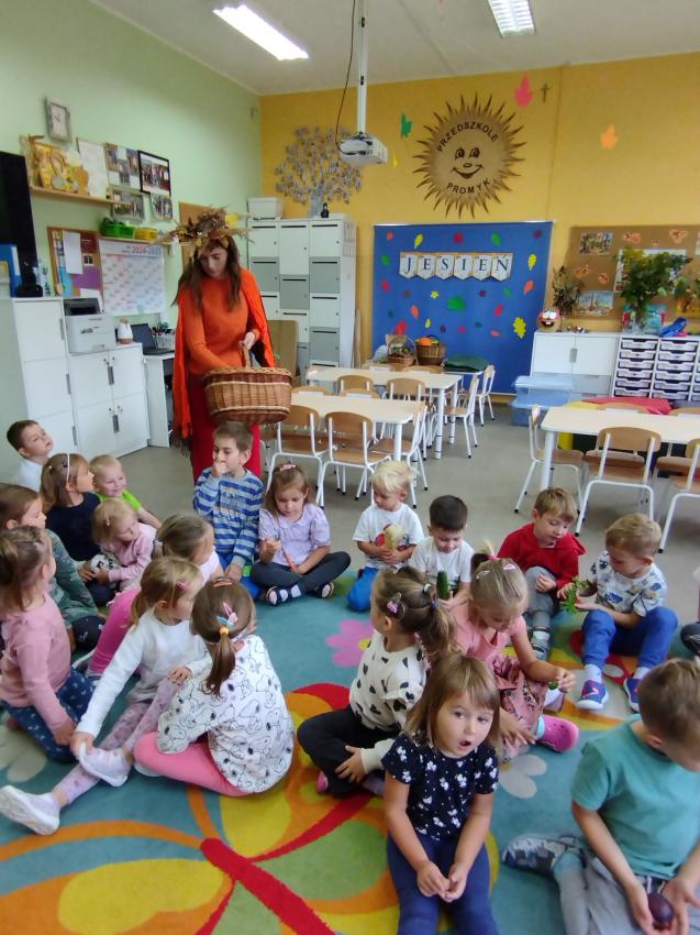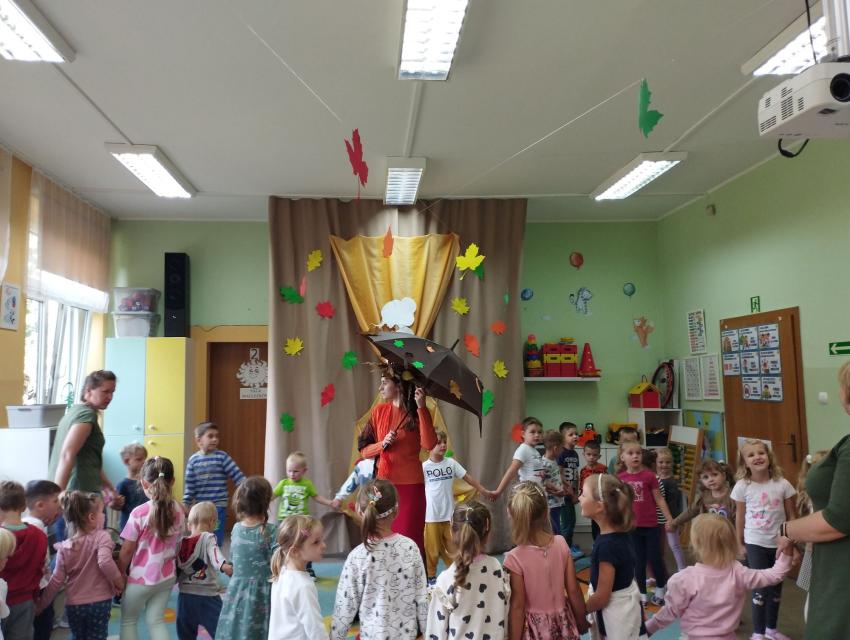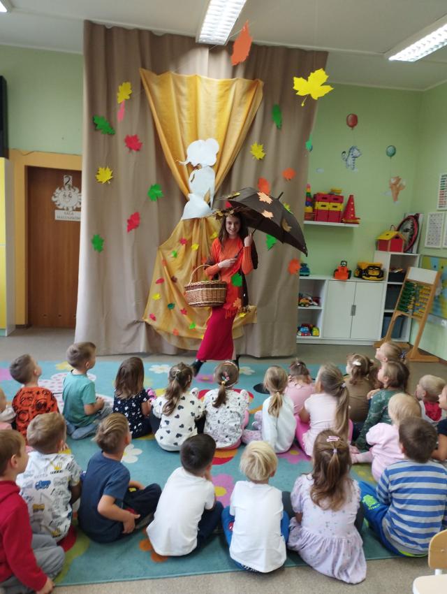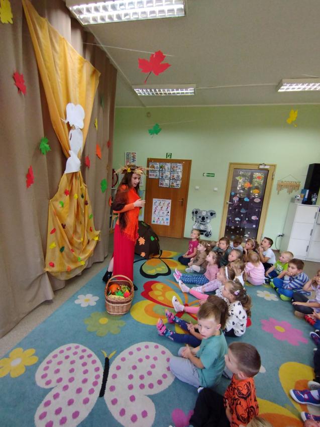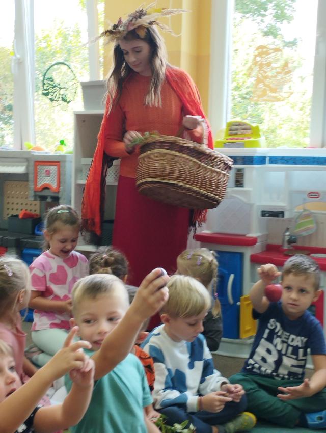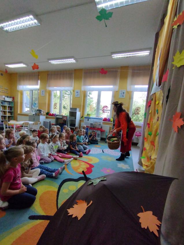 Nasze przedszkole odwiedziła dziś Pani Jesień z koszem pełnym darów jesiennych. Dzieci wesoło przywitały nowa porą roku i świetnie się z nią bawiły.