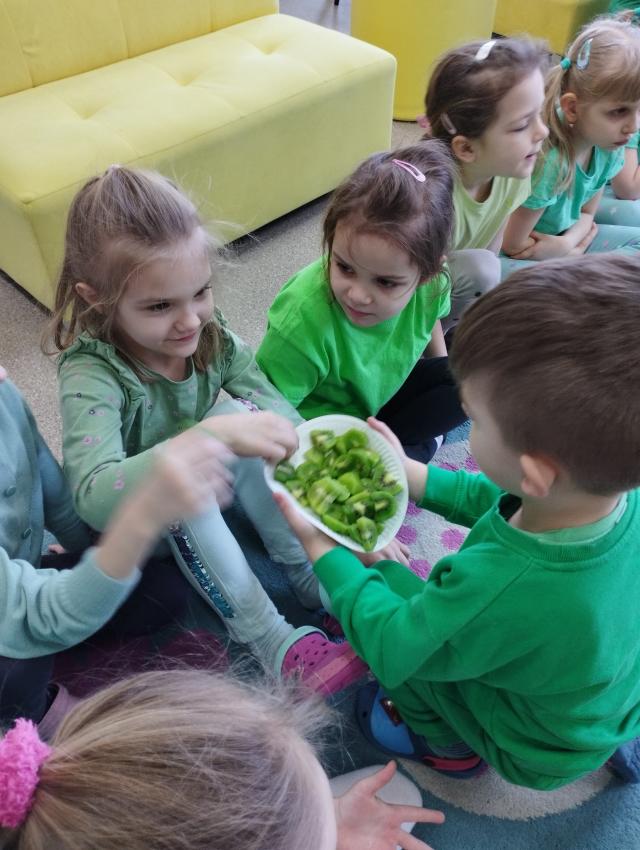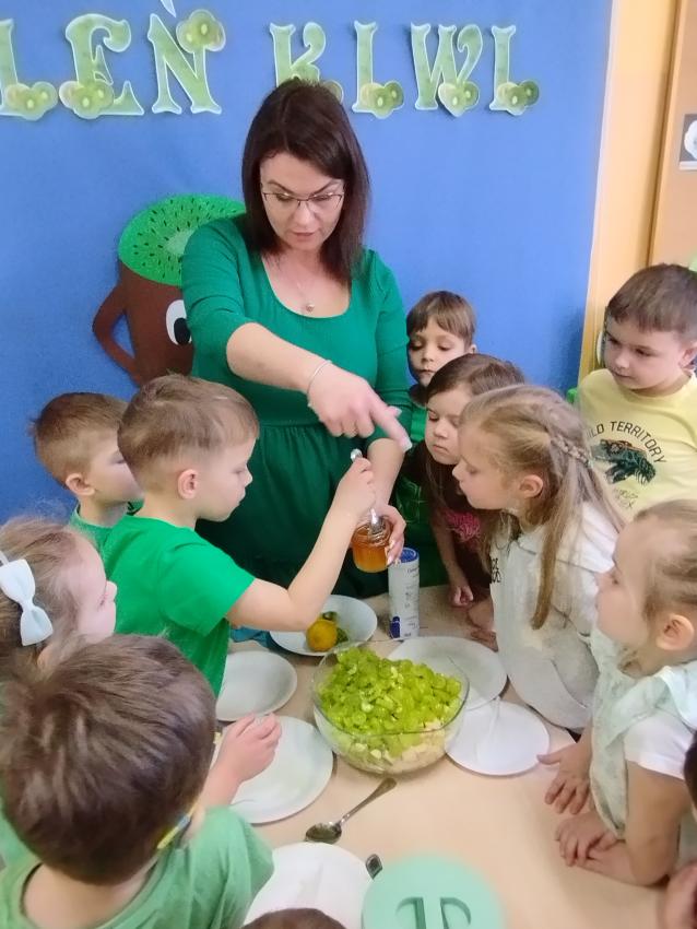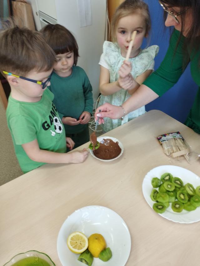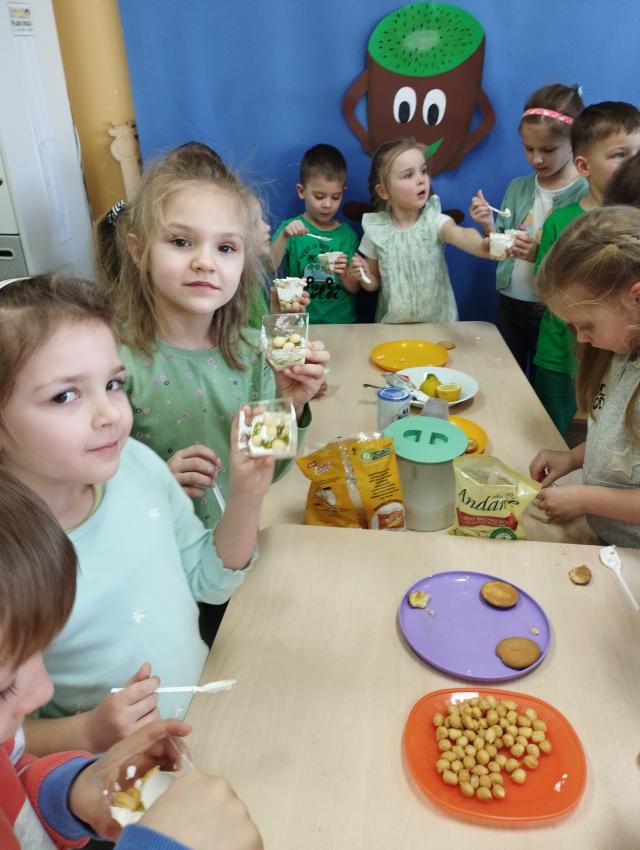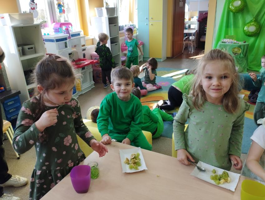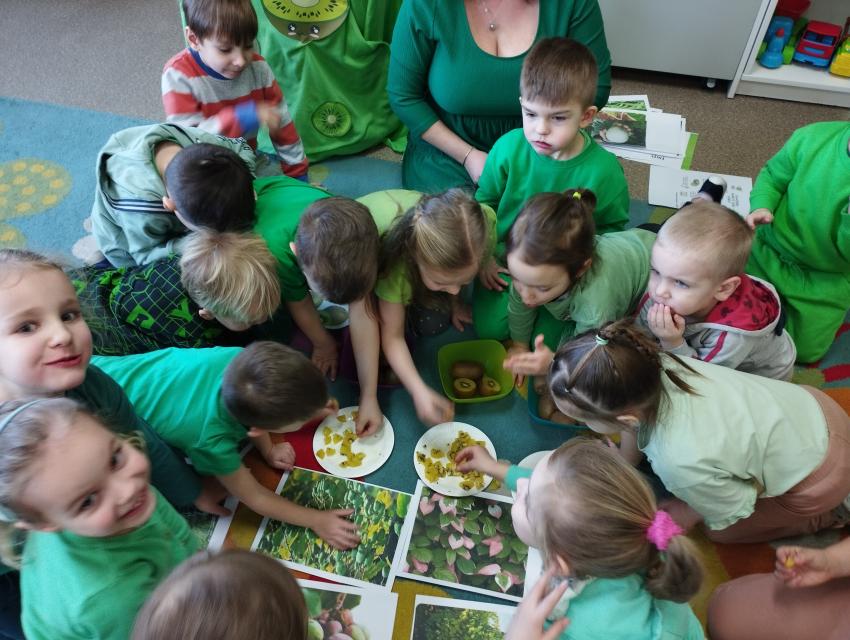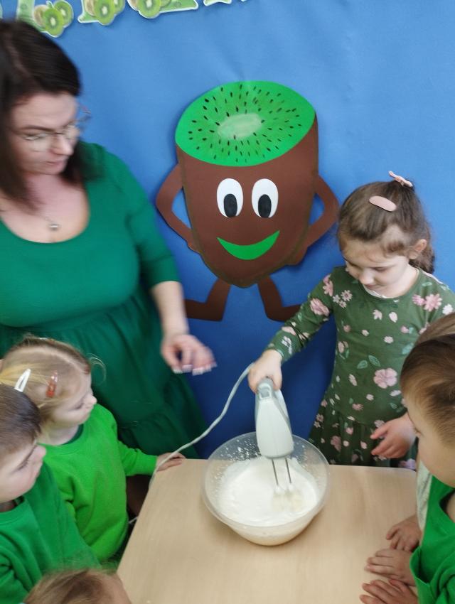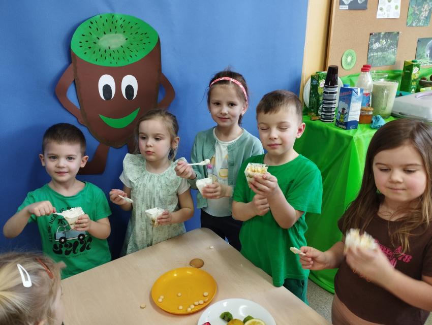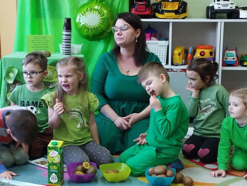 Okrągły owoc włochaty, w witaminę C bogaty. Miąższ zielony skrywa w sobie, oczek- pestek ilość mnogą co napatrzeć się nie mogą! Nikogo wierszyk nie zdziwi, bo wiadomo, że to KIWI!!! Podczas Dnia Kiwi dzieci tworzyły różne dania z tego owocu i mogły się nimi delektować. Poznały również skąd pochodzi kiwi i jakie są jego rodzaje.