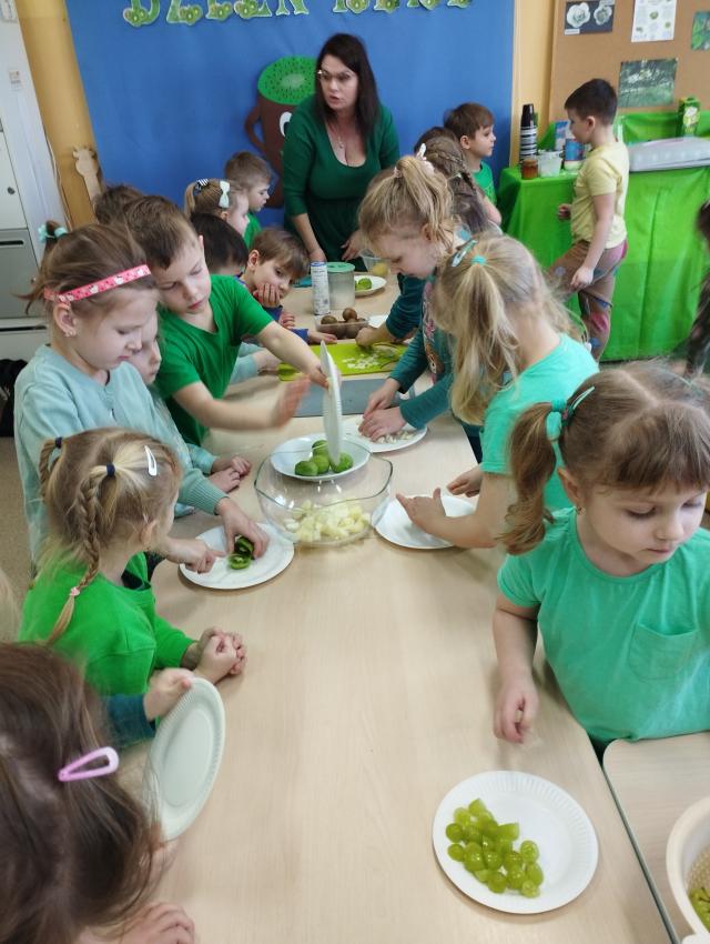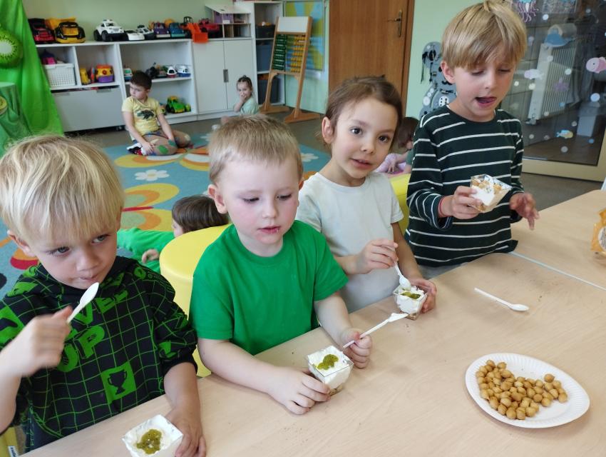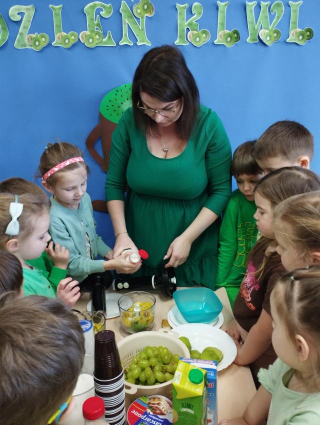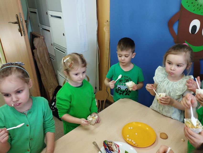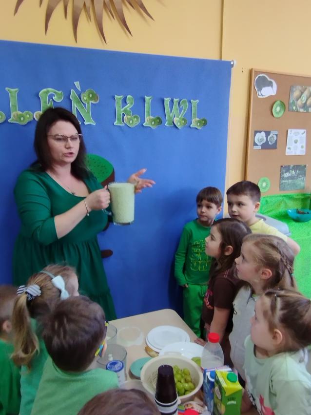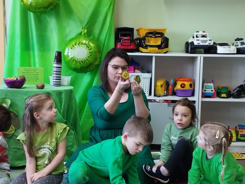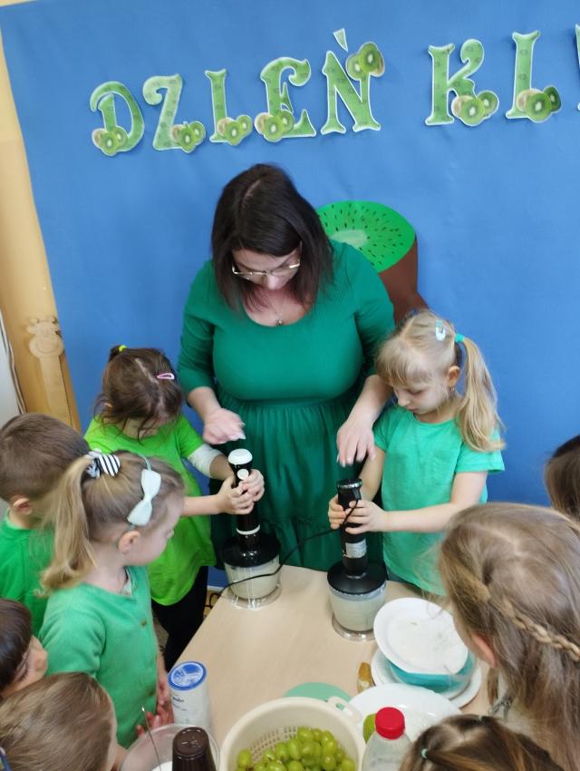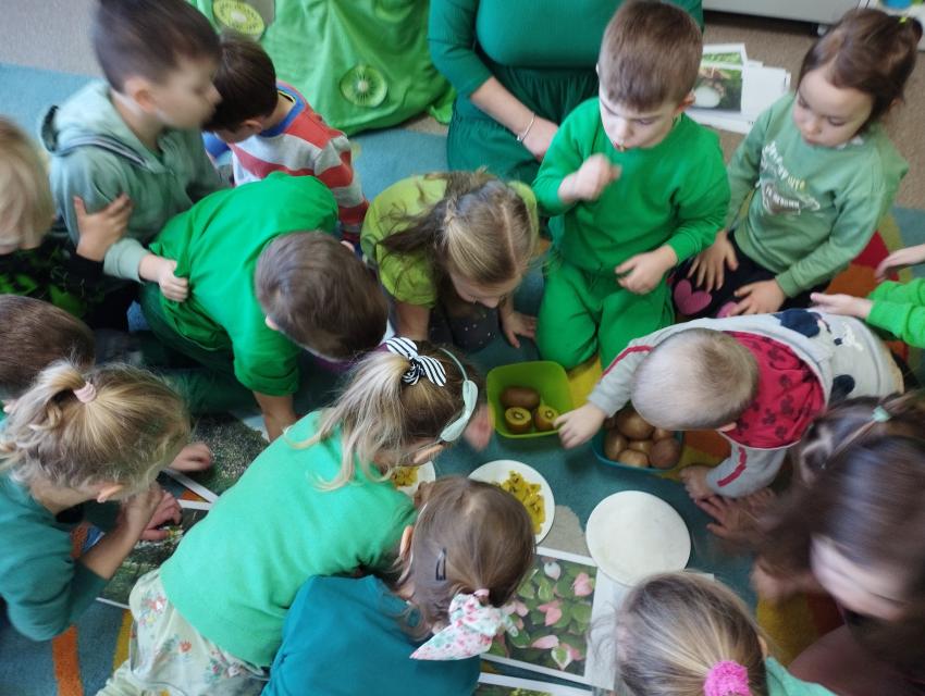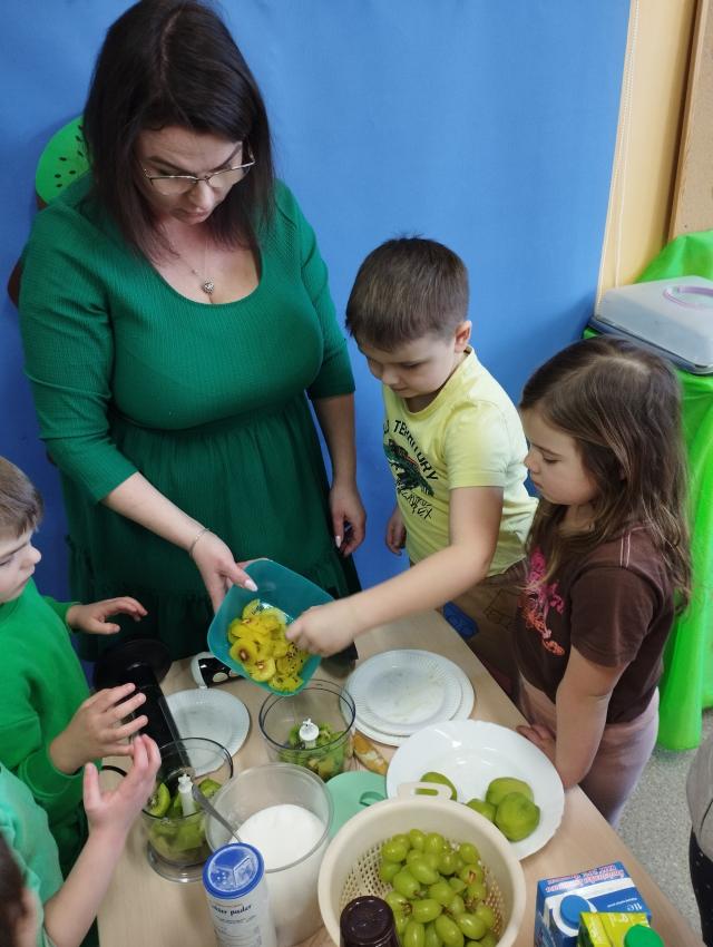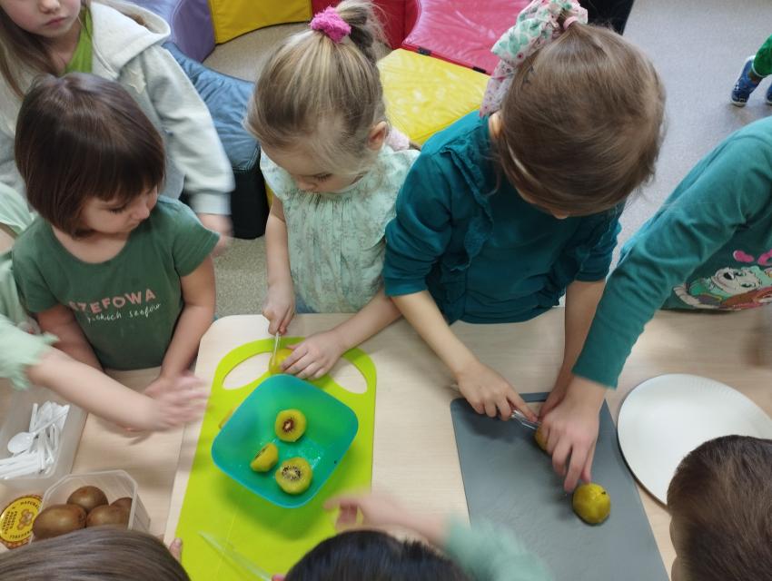 Okrągły owoc włochaty, w witaminę C bogaty. Miąższ zielony skrywa w sobie, oczek- pestek ilość mnogą co napatrzeć się nie mogą! Nikogo wierszyk nie zdziwi, bo wiadomo, że to KIWI!!! Podczas Dnia Kiwi dzieci tworzyły różne dania z tego owocu i mogły się nimi delektować. Poznały również skąd pochodzi kiwi i jakie są jego rodzaje.