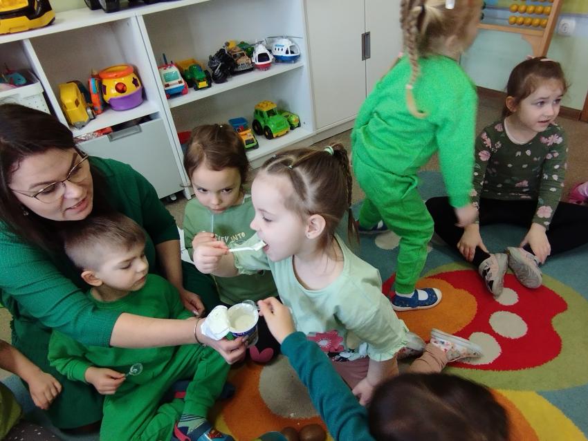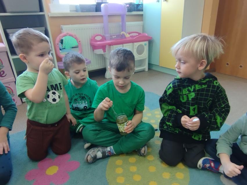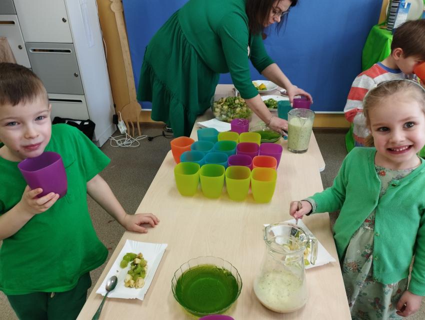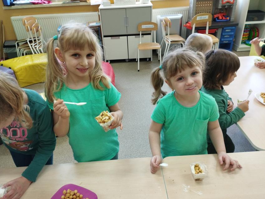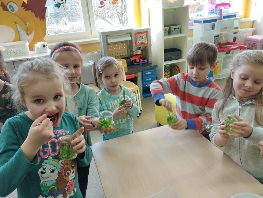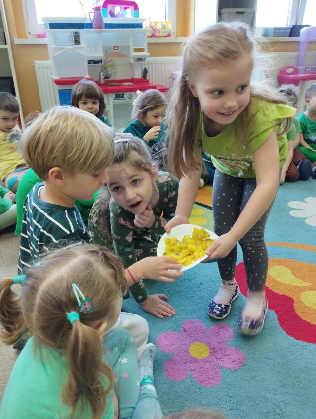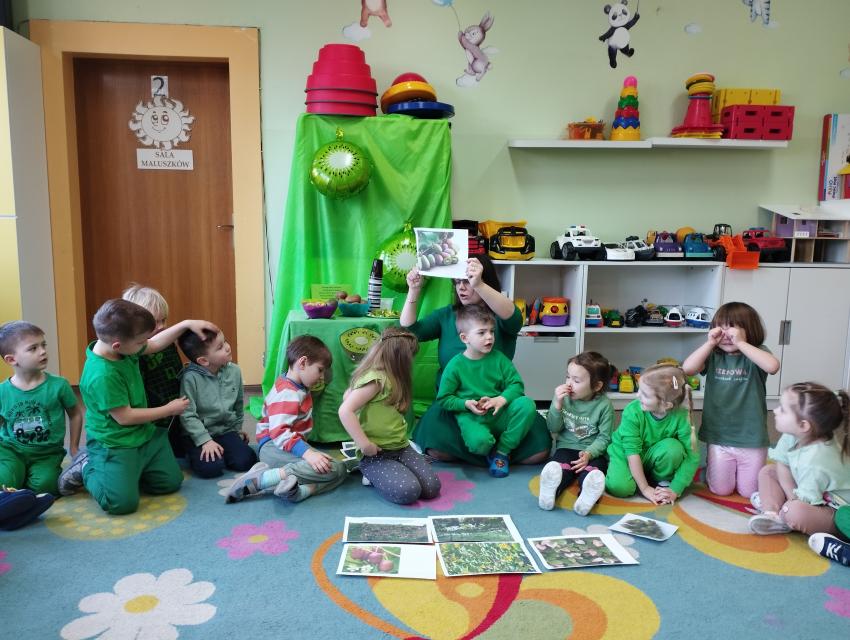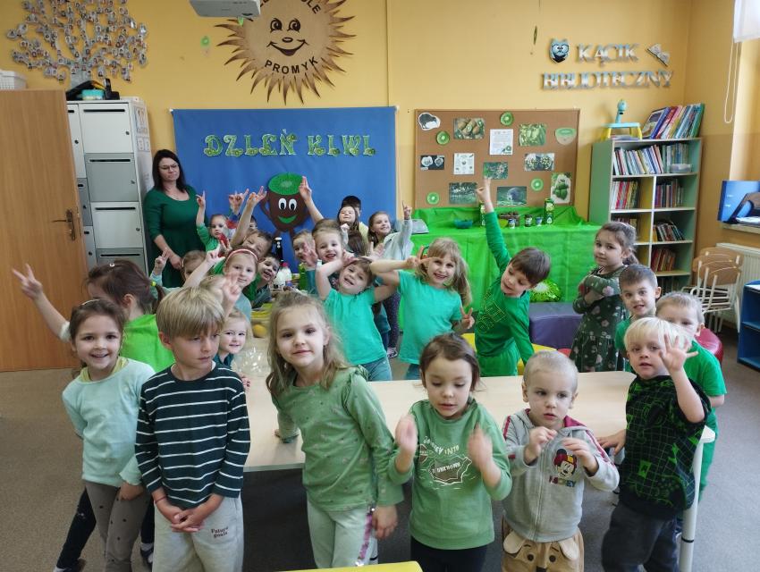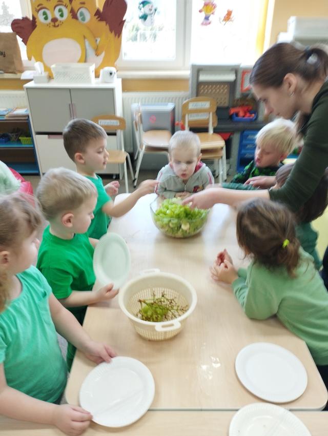 Okrągły owoc włochaty, w witaminę C bogaty. Miąższ zielony skrywa w sobie, oczek- pestek ilość mnogą co napatrzeć się nie mogą! Nikogo wierszyk nie zdziwi, bo wiadomo, że to KIWI!!! Podczas Dnia Kiwi dzieci tworzyły różne dania z tego owocu i mogły się nimi delektować. Poznały również skąd pochodzi kiwi i jakie są jego rodzaje.