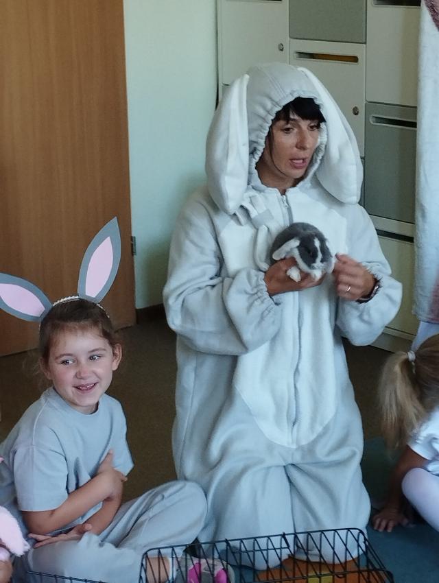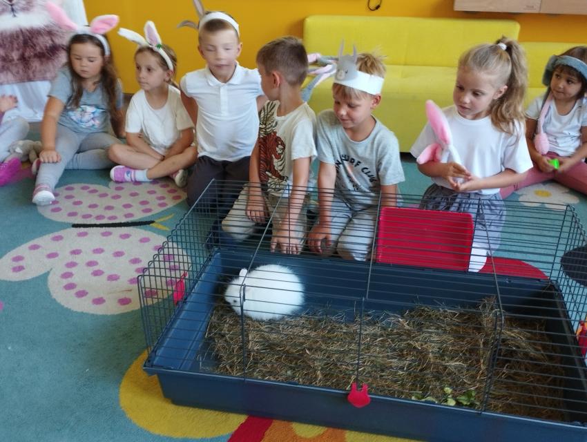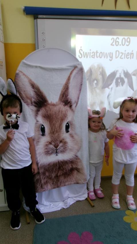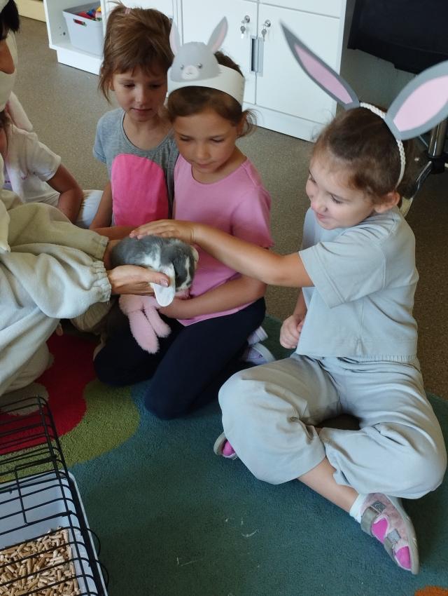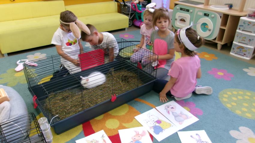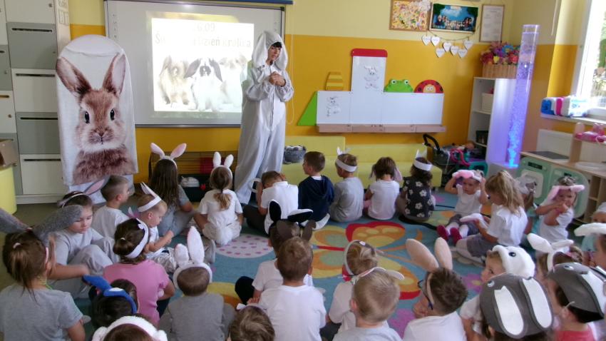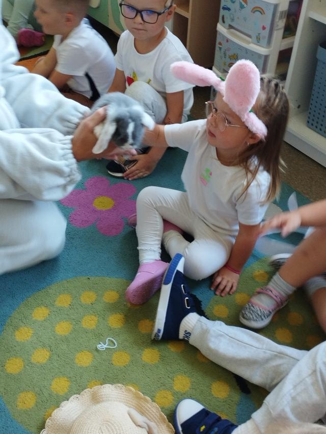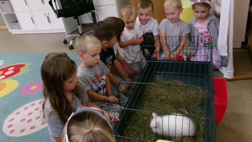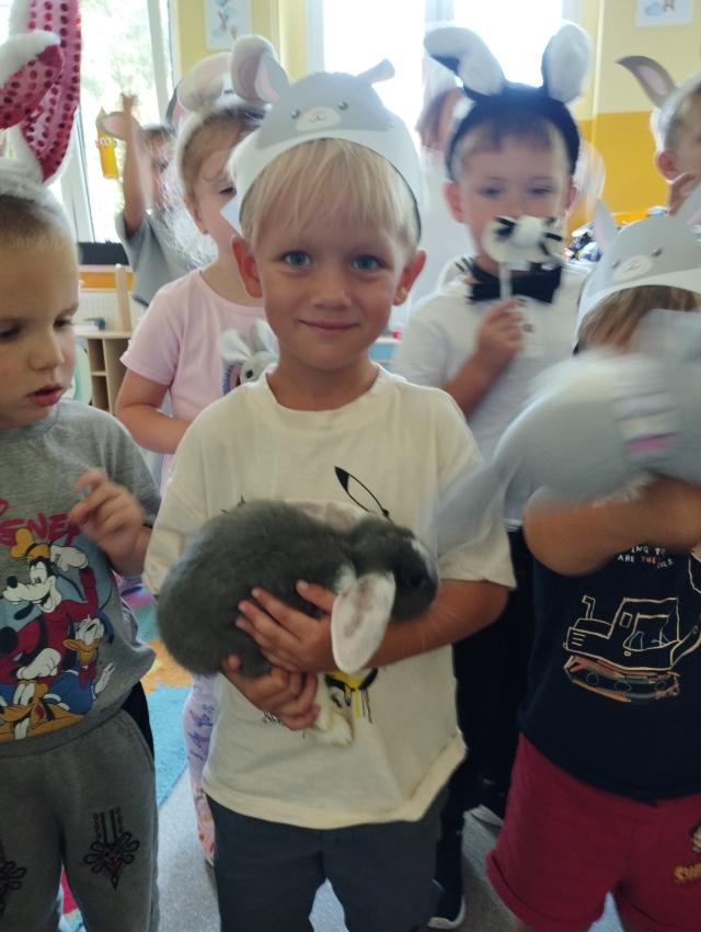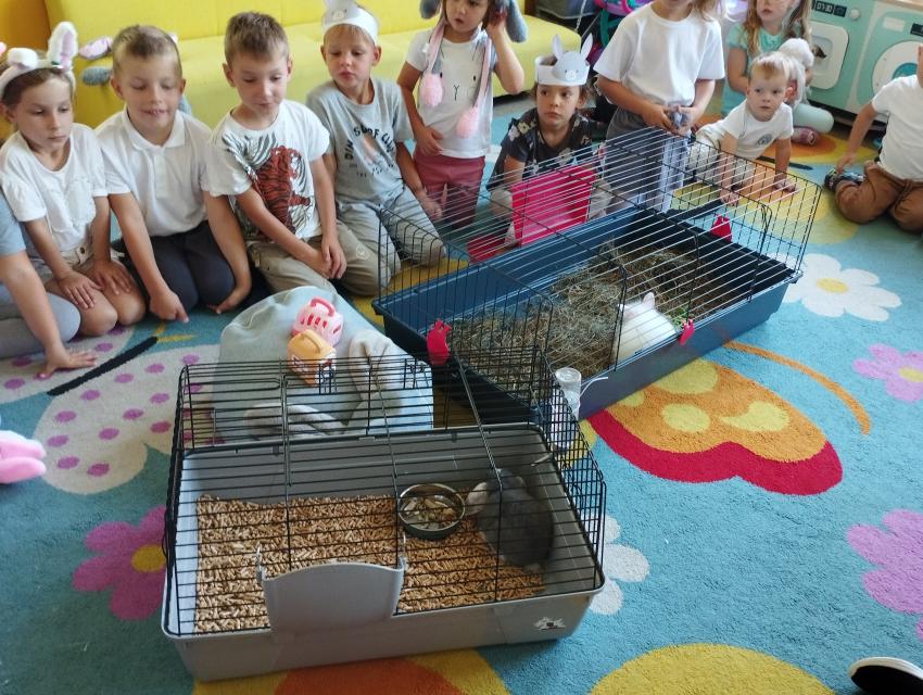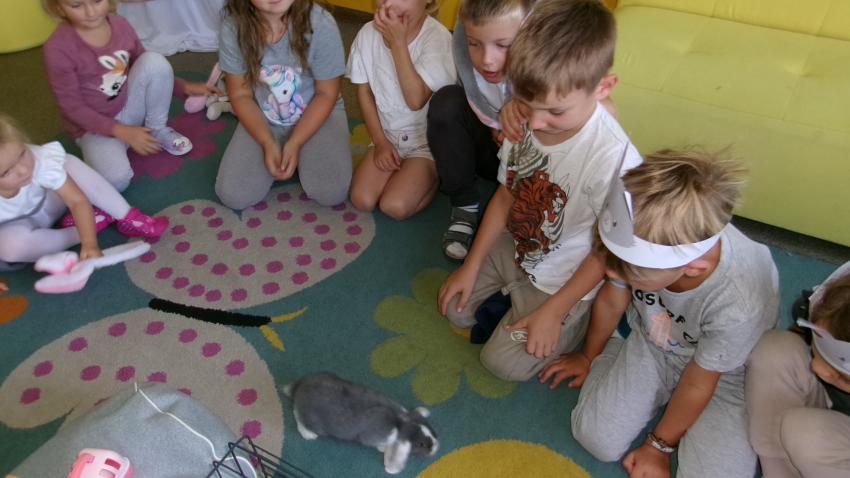 Największą atrakcją dnia był prawdziwe króliki, który odwiedził nasze przedszkole! Dzieci były zachwycone możliwością poznania ich z bliska, mogły je pogłaskać, nakarmić świeżą marchewką i sałatą, a także poobserwować, jak radośnie kica. Jeden z nich zostanie w przedszkolu na zawsze. Dzieci  wybrały dla niego imię ? Tuptuś! Królik to pierwsze zwierzątko, które poznajemy w ramach programu  Promyczki poznają zwierzęta.