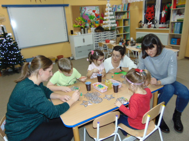 W piątek po południu spotkaliśmy się w naszym przedszkolu wspólnie z rodzicami, aby stworzyć w placówce magiczną atmosferę Świąt Bożego Narodzenia. Na przygotowanych stanowiskach mogliśmy stworzyć świąteczne ozdoby - skarpety z kolorowego papieru, styropianowe bombki, kolorowe bombki malowane farbkami oraz ozdoby z drzewka iglastego. Dziękujemy mamusiom za przygotowanie pięknych, nowych stroików na drzwi naszego przedszkola! A tatusiowi za pomoc w udekorowaniu wejścia do przedszkola. Mogliśmy wykonać pamiątkowe zdjęcie w świątecznej odsłonie i udekorować pierniczki. Wspólnie przyozdobiliśmy również choinkę. Dziękujemy wszystkim za przybycie i spędzenie wspólnie tego radosnego popołudnia. :)