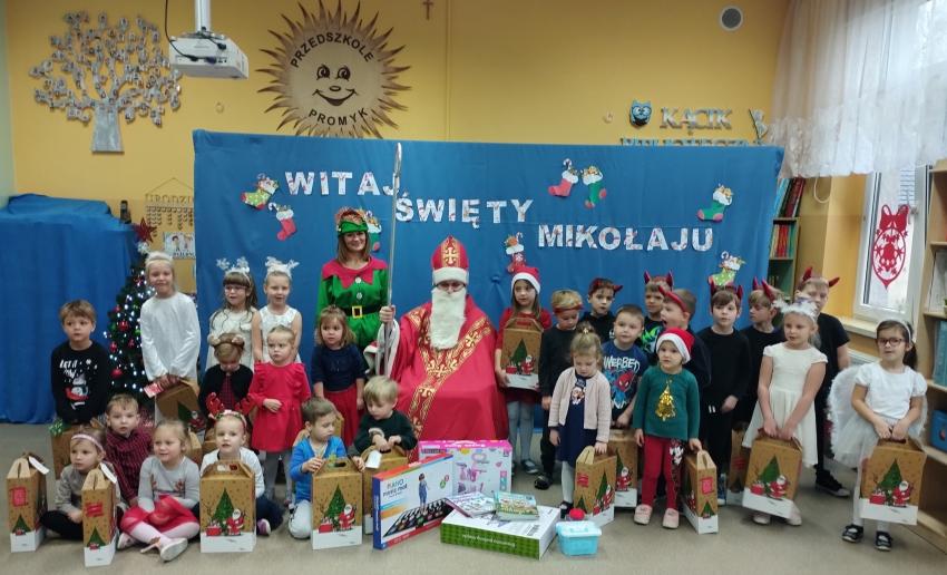 Dziś w przedszkolu odwiedził nas św. Mikołaj wraz z Elfem i przywieźli dla nas ogromny wór prezentów! Przygotowaliśmy krótki występ o zaginionych prezentach, który bardzo się Mikołajowi spodobał. W nagrodę zostawił również prezenty dla całego naszego przedszkola - nowe zabawki do naszej sali. Obiecaliśmy, że będziemy grzeczni i nie możemy doczekać się spotkania w przyszłym roku.