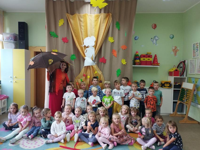 Nasze przedszkole odwiedziła dziś Pani Jesień z koszem pełnym darów jesiennych. Dzieci wesoło przywitały nowa porą roku i świetnie się z nią bawiły.