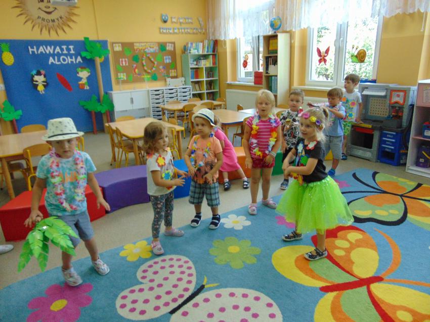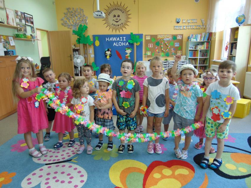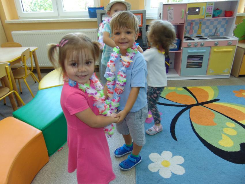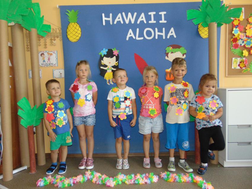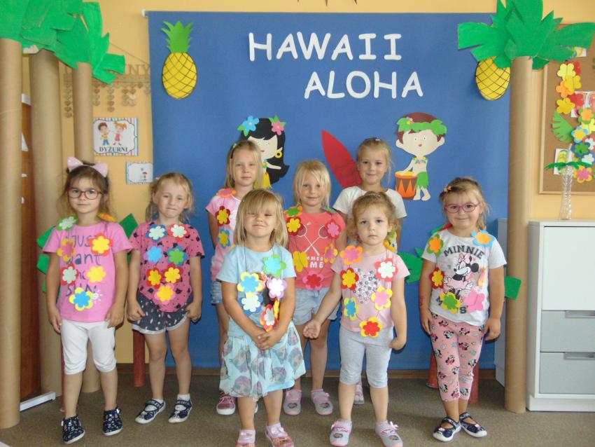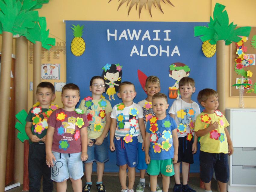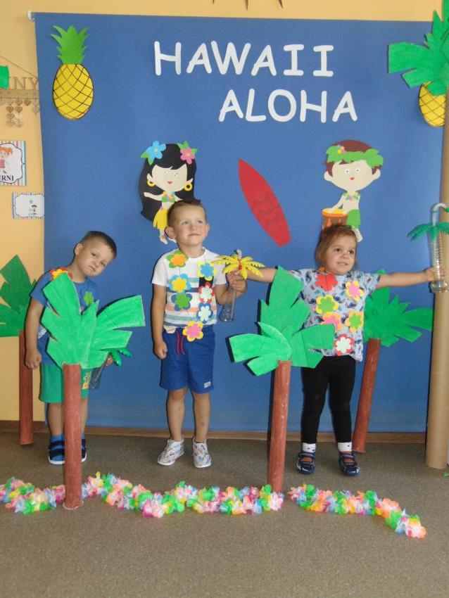 W tym tygodniu poznaliśmy kolejny kraj - Hawaje. Dowiedzieliśmy się, że Hawajczycy witają się i pozdrawiają, mówiąc "Aloha!". Wykonaliśmy kolorowe papugi, które ozdabiają naszą gazetkę, zrobiliśmy hawajski naszyjnik Lei, tańczyliśmy taniec hula i bawiliśmy się przy hawajskich rytmach. Było bardzo kolorowo i radośnie!