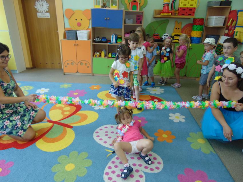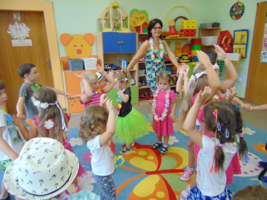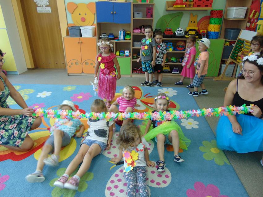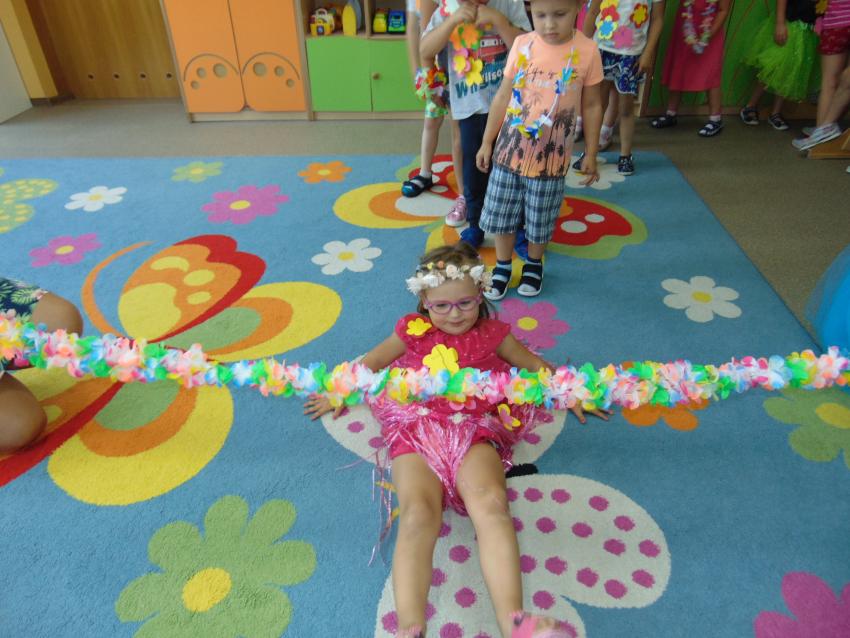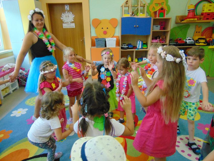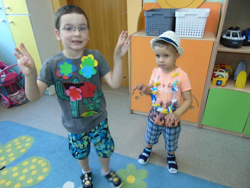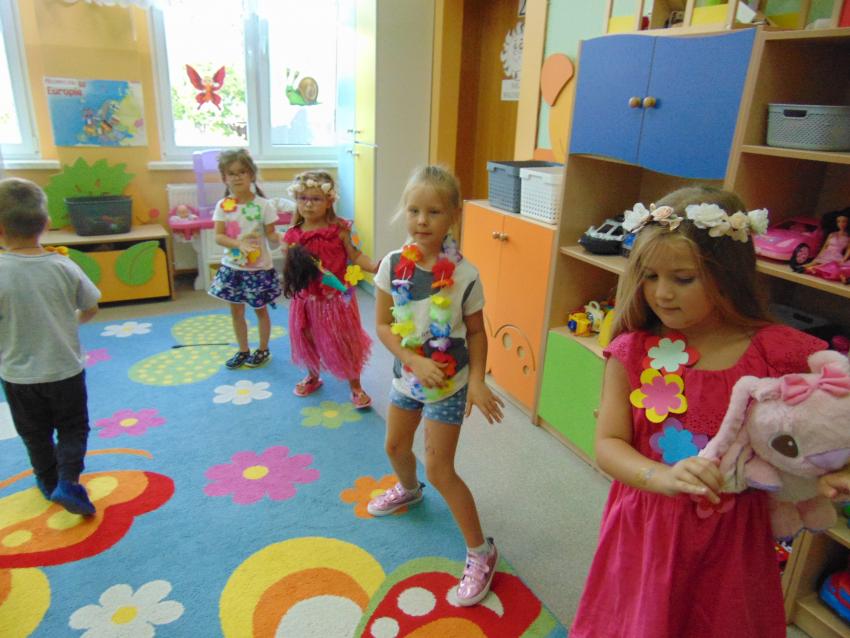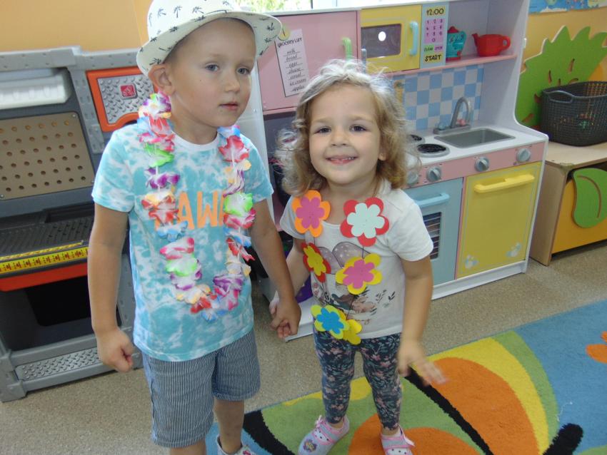 W tym tygodniu poznaliśmy kolejny kraj - Hawaje. Dowiedzieliśmy się, że Hawajczycy witają się i pozdrawiają, mówiąc "Aloha!". Wykonaliśmy kolorowe papugi, które ozdabiają naszą gazetkę, zrobiliśmy hawajski naszyjnik Lei, tańczyliśmy taniec hula i bawiliśmy się przy hawajskich rytmach. Było bardzo kolorowo i radośnie!