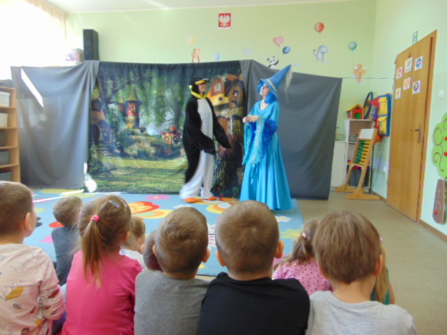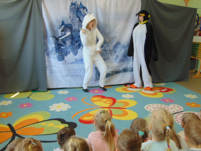 Dzisiaj do naszego przedszkola przyjechał teatrzyk z bajką - Zimowa kraina. Wszystkie przedszkolaki z wielkim zaciekawieniem oglądały przedstawienie, a nawet brały w nim czynny udział pomagając bohaterom.