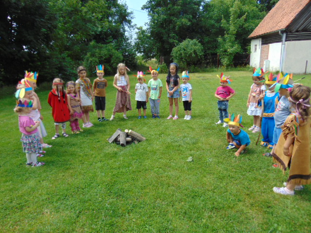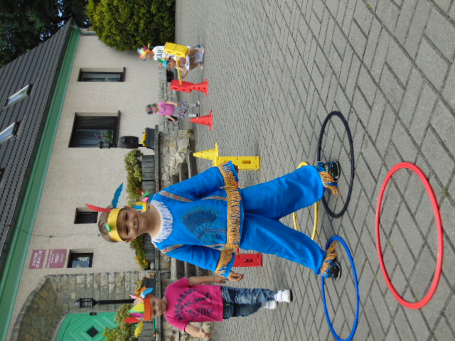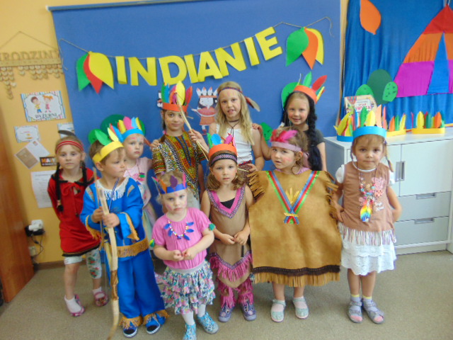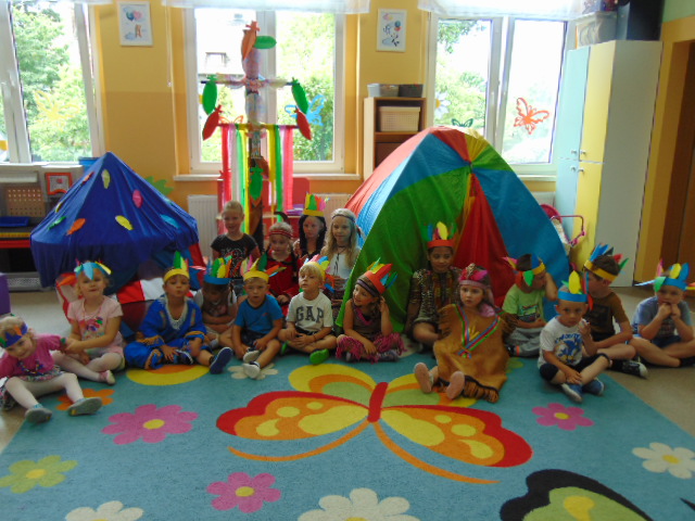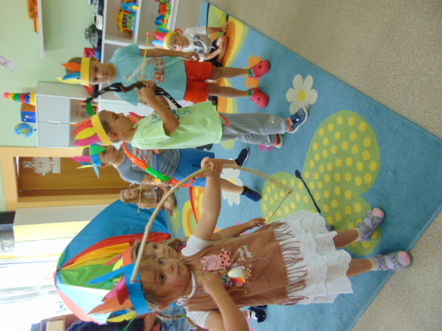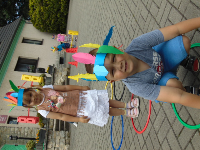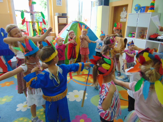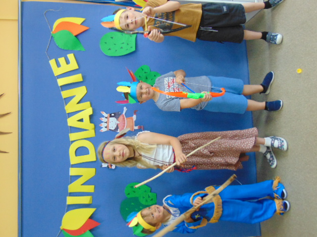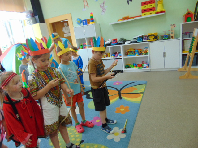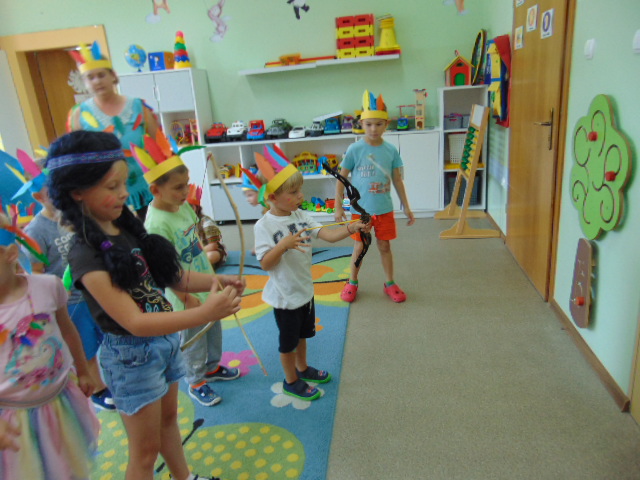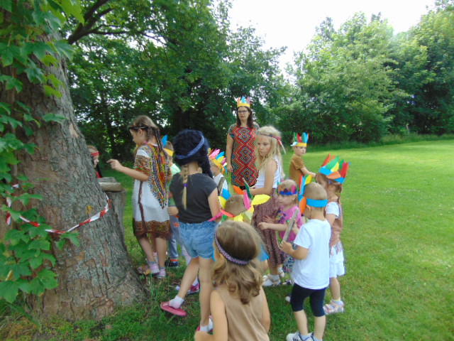 To był pierwszy wakacyjny tydzień wspaniałej zabawy w wiosce indiańskiej. Zabawy, połączonej z nauką na temat kultury Indian. Tematem przewodnim prac byli Indianie, portrety, pióropusze, łapacze snów, wioska indiańska. W czwartek dzieci przebrały się za prawdziwych Indian- świetnie się bawiły, a my razem nimi.