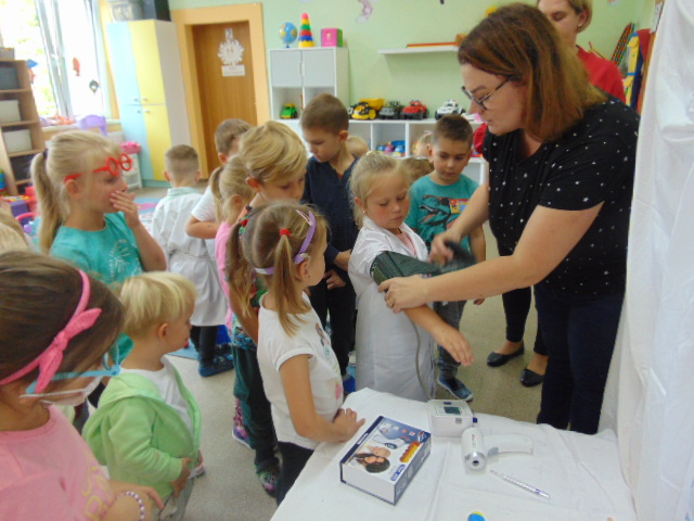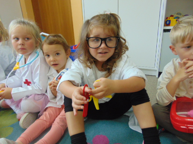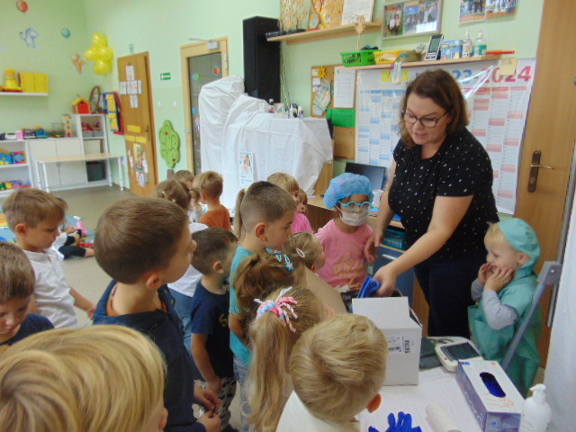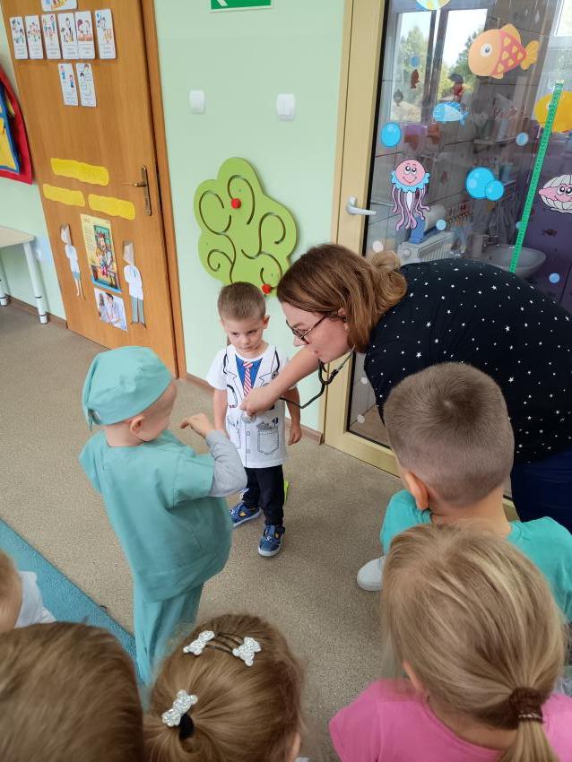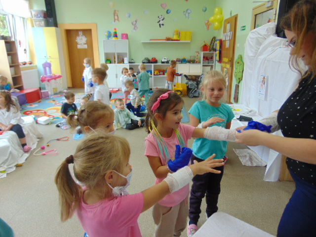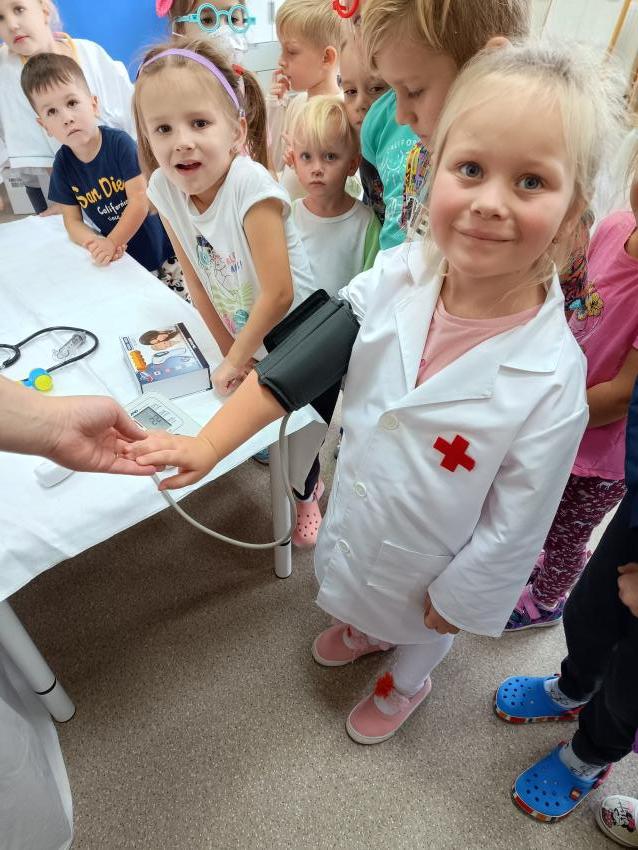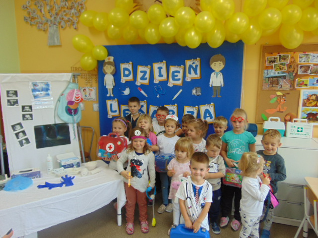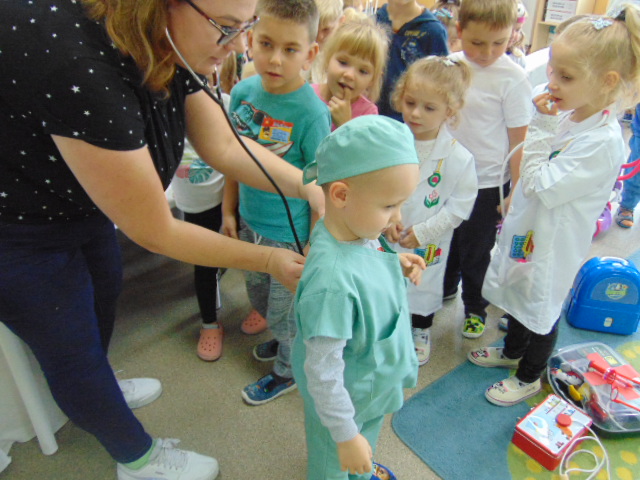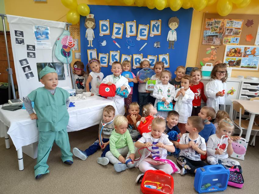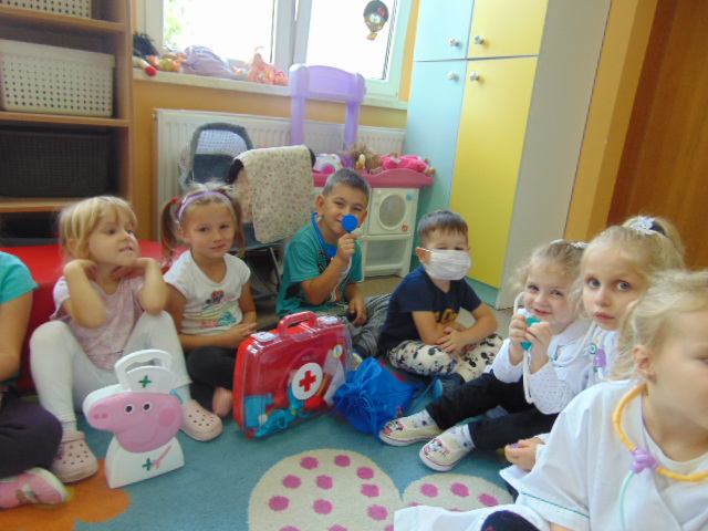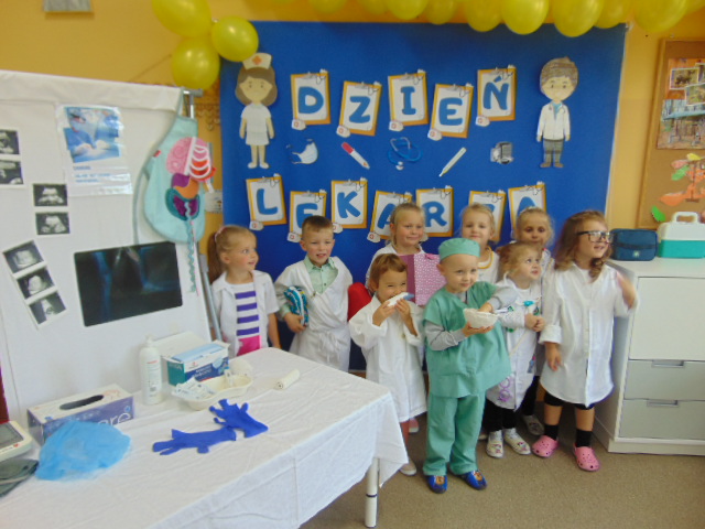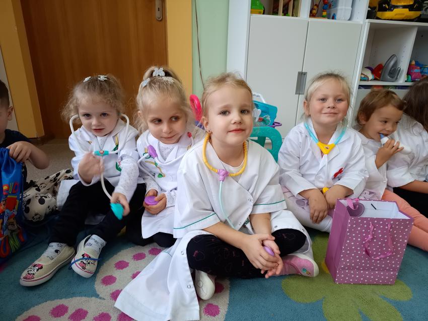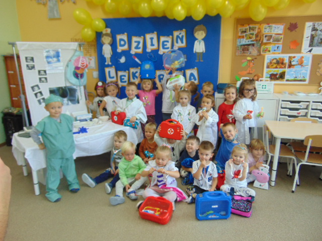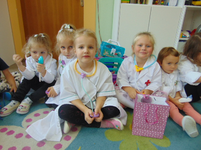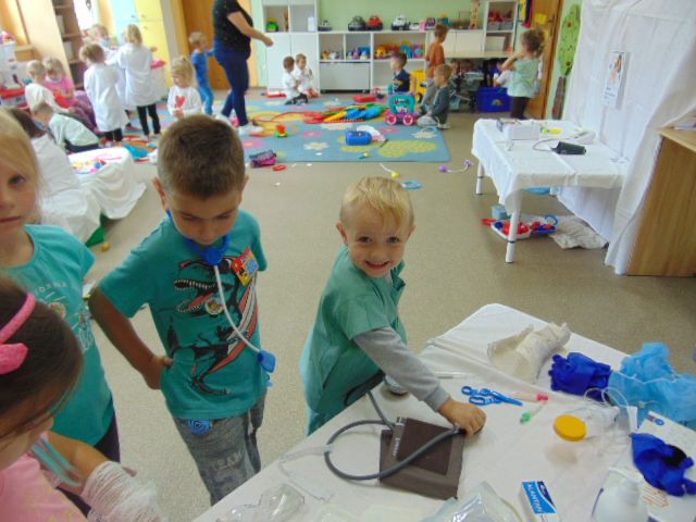 W ramach programu edukacyjnego ?Promyczki poznają zawody? w październiku nasze przedszkolaki poznają zawód lekarza. Dzieci miały okazję poznać różne specjalności lekarzy oraz zobaczyć atrybuty lekarskie takie jak stetoskop, kroplówka, pulsoksymetr, ciśnieniomierz, zdjęcia usg i rtgk i wiele innych. Mogły też zobaczyć jak wykonuje się gips i same wcielić się w role lekarzy.
