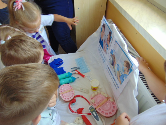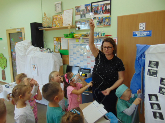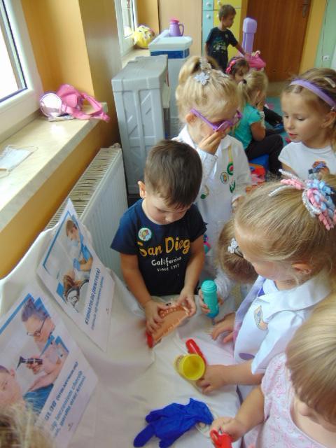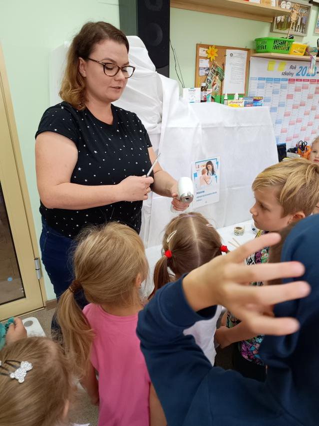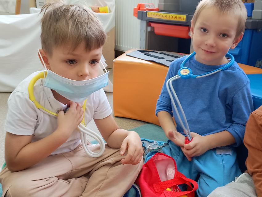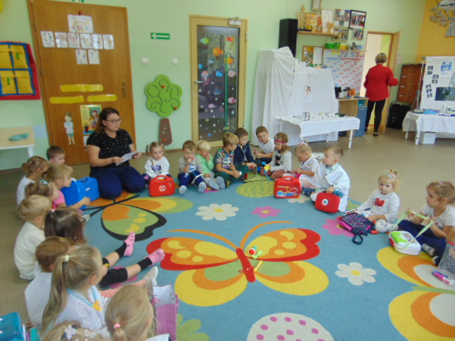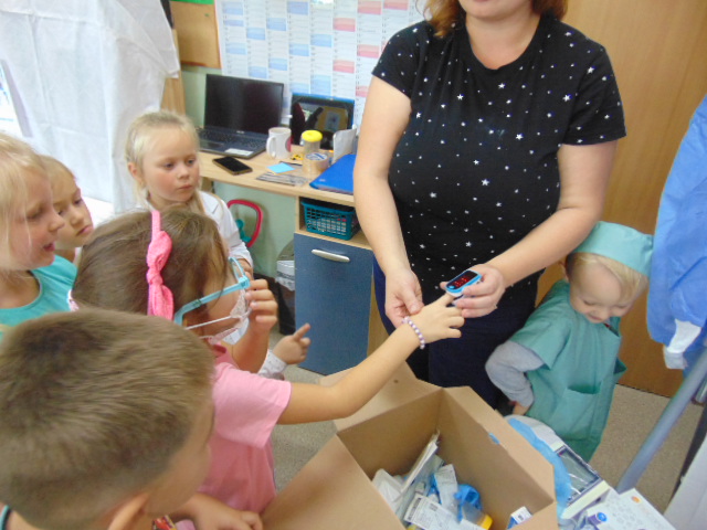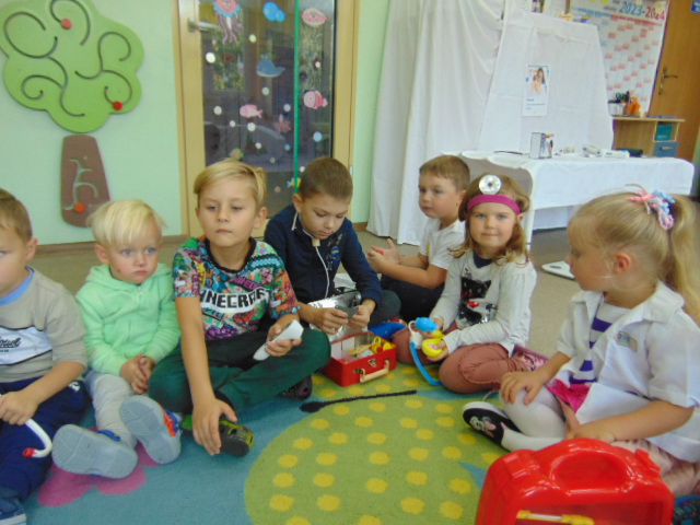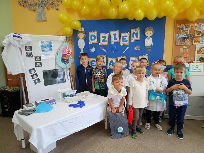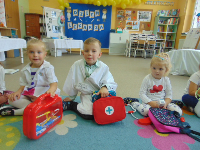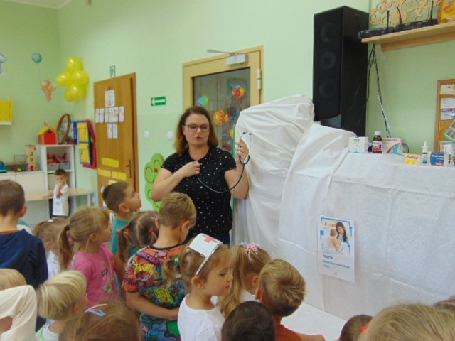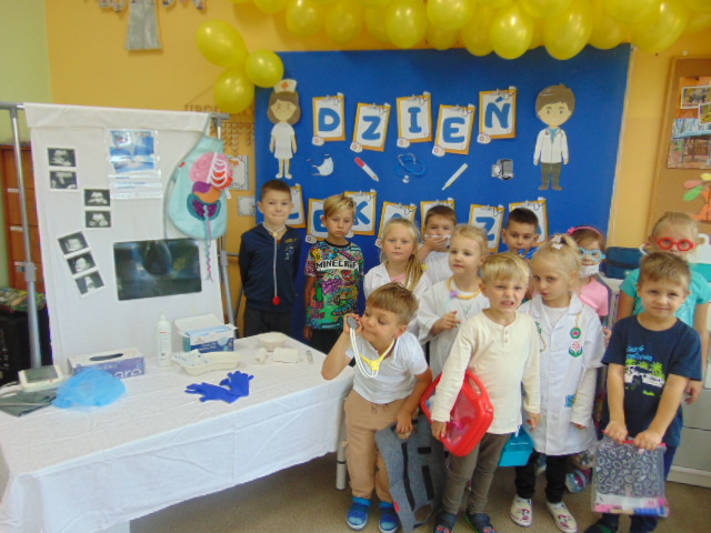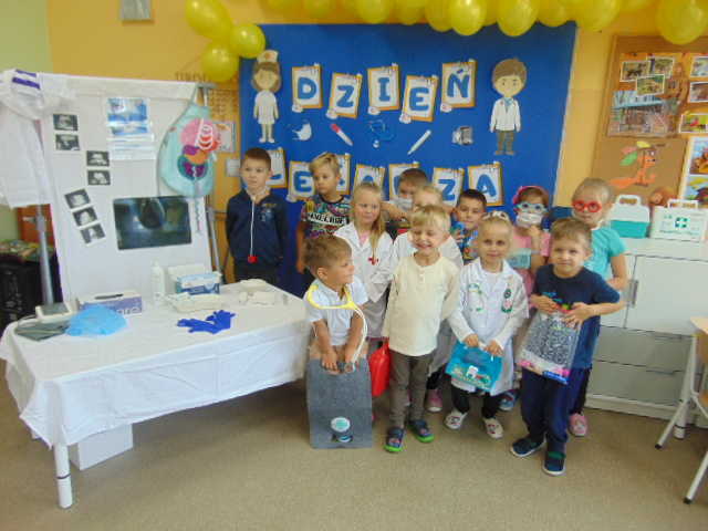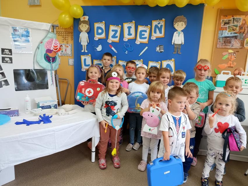 W ramach programu edukacyjnego ?Promyczki poznają zawody? w październiku nasze przedszkolaki poznają zawód lekarza. Dzieci miały okazję poznać różne specjalności lekarzy oraz zobaczyć atrybuty lekarskie takie jak stetoskop, kroplówka, pulsoksymetr, ciśnieniomierz, zdjęcia usg i rtgk i wiele innych. Mogły też zobaczyć jak wykonuje się gips i same wcielić się w role lekarzy.