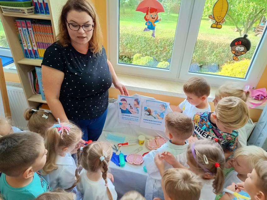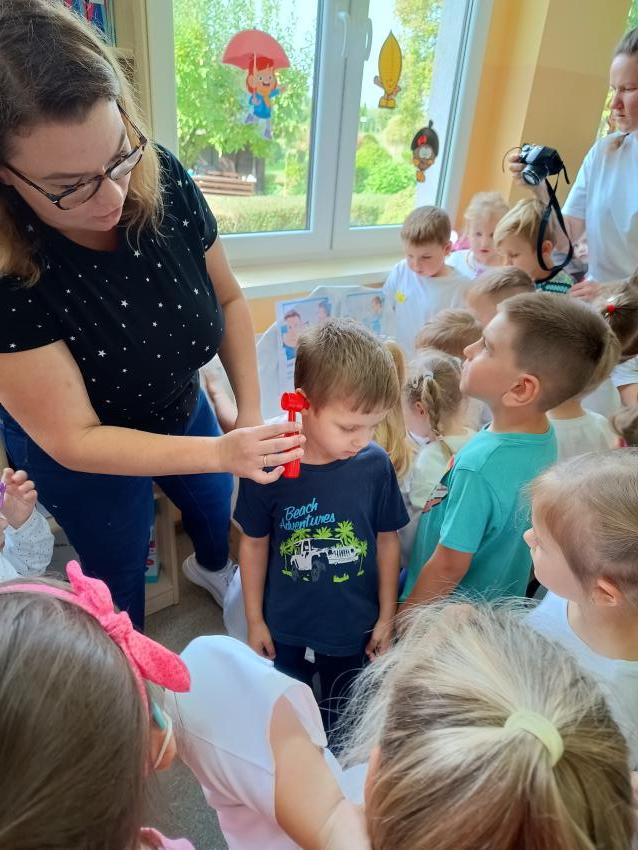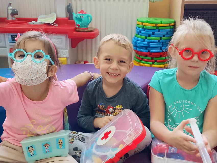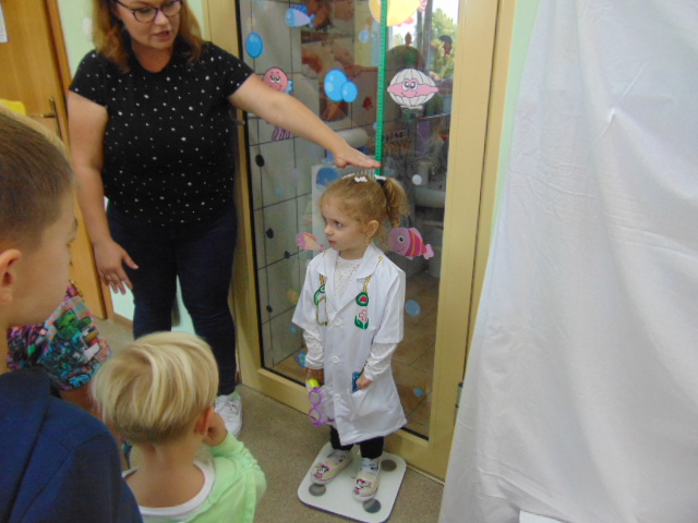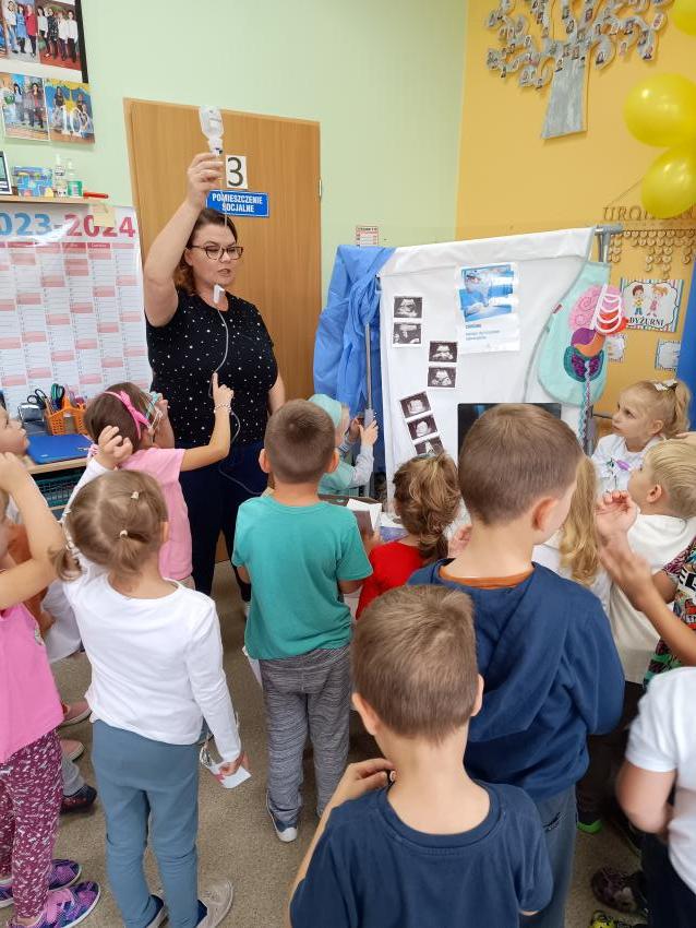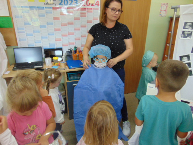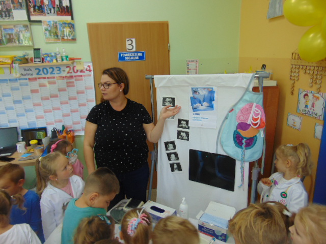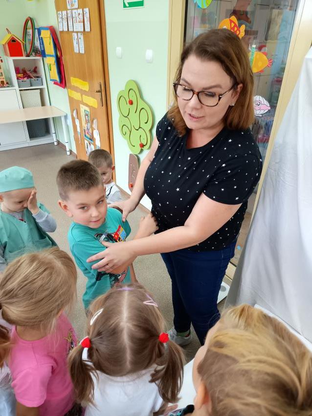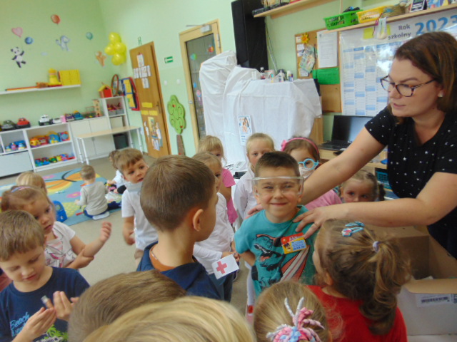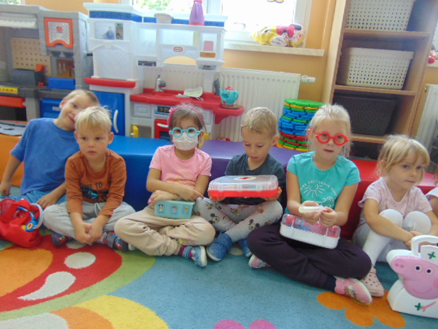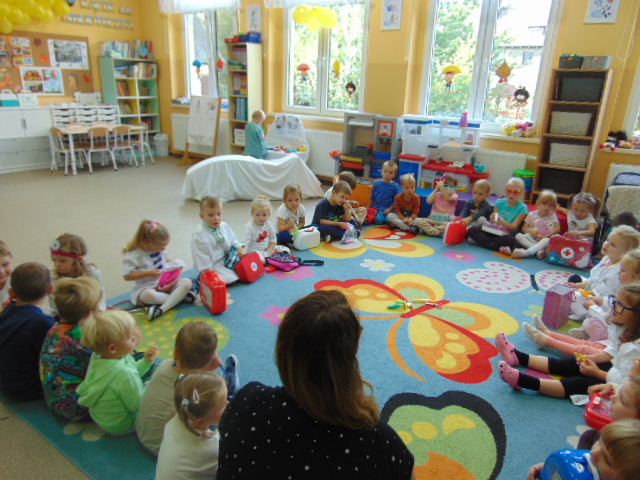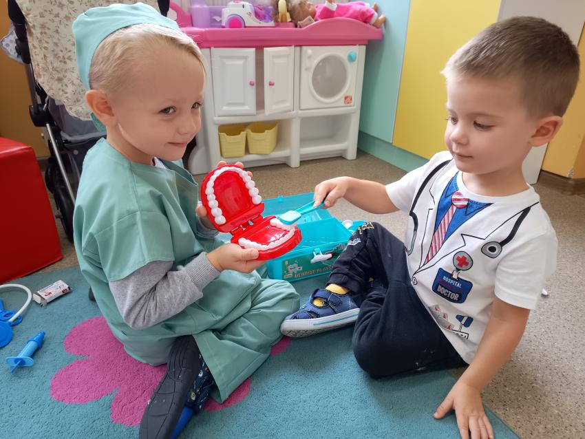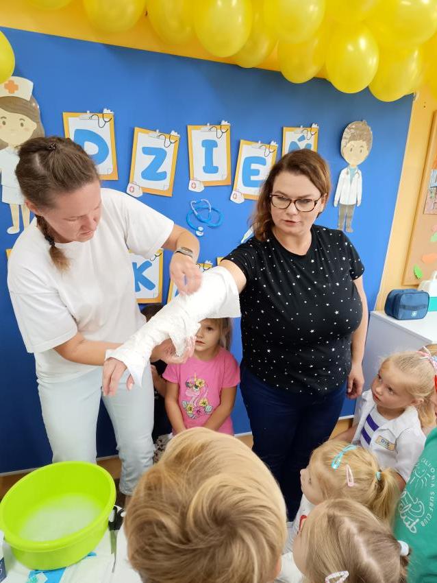 W ramach programu edukacyjnego ?Promyczki poznają zawody? w październiku nasze przedszkolaki poznają zawód lekarza. Dzieci miały okazję poznać różne specjalności lekarzy oraz zobaczyć atrybuty lekarskie takie jak stetoskop, kroplówka, pulsoksymetr, ciśnieniomierz, zdjęcia usg i rtgk i wiele innych. Mogły też zobaczyć jak wykonuje się gips i same wcielić się w role lekarzy.
