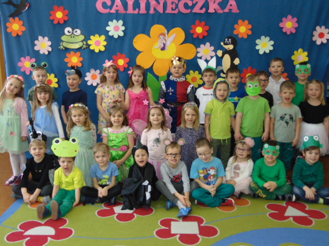 W dniu dzisiejszym Promyczki poznały przygody Calineczki. Wszystkie dzieci przyszły do przedszkola przebrane za postacie wystepujące w baśni. Dekoracja w sali pozwoliła nam wyobrazic sobie, że bawimy się razem z Calineczką na kolorowej łące.