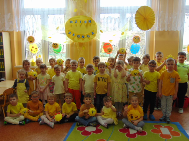 "Dookoła słońca kręcą się dzieciaki..." 18 marca to międzynarowdowy Dzień Słońca, który obchodzimy co roku. W dniu dzisiejszym wszystkie dzieci przyszły do przedszkola ubrane w słoneczne żółte stroje. Kolor żółty, który dzisiaj nas otaczał sprawił, że dzieci z pozytywną energią podchodziły do zadań jakie przygotowało dla nich Słoneczko. Przez cały dzień królowały zabawy ze słońcem w roli głównej.